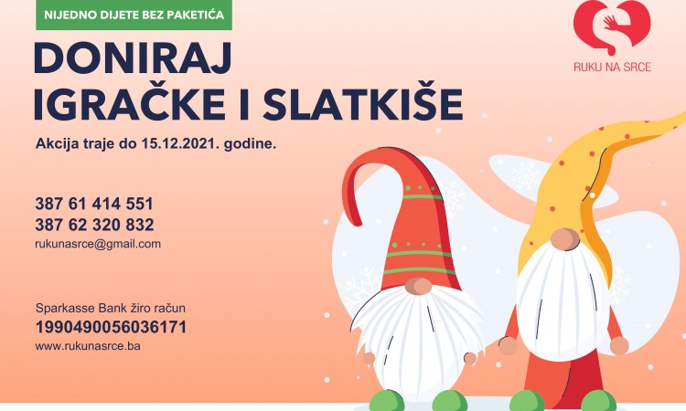 Udruženje ‘Ruku na srce’ omogućilo je, u projektu ‘Nijedno dijete bez paketića’ doniranje igračaka, slatkiša, školskog pribora, novac ili već pripremljene novogodišnje paketiće za djecu čiji roditelji im to ne mogu osigurati.