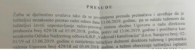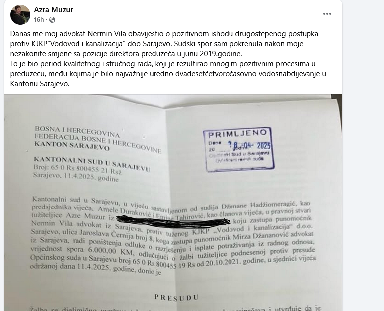 “Danas me moj advokat Nermin Vila obavijestio o pozitivnom ishodu drugostepenog postupka protiv KJKP”Vodovod i kanalizacija” doo Sarajevo. Sudski spor sam pokrenula nakon moje nezakonite smjene sa pozicije direktora preduzeća u junu 2019.godine. To je bio period kvalitetnog i stručnog rada, koji je rezultirao mnogim pozitivnim procesima u preduzeću, među kojima je bilo najvažnije uredno dvadesetčetvoročasovno vodosnabdijevanje u Kantonu Sarajevo”, navela je Muzur na društvenim mrežama.