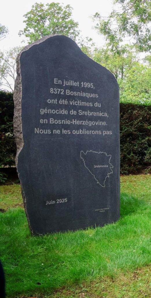„Danas iskazujemo poštovanje prema žrtvama jedinog genocida na evropskom tlu nakon 1945. godine. U srcu Pariza, na groblju Père Lachaise, otkrivamo Spomenik posvećen žrtvama genocida nad Bošnjacima u Sigurnoj zoni UN-a Srebrenica. Spomenik posvećen genocidu nad Bošnjacima zauvijek će stajati ovdje, u Parizu“.
