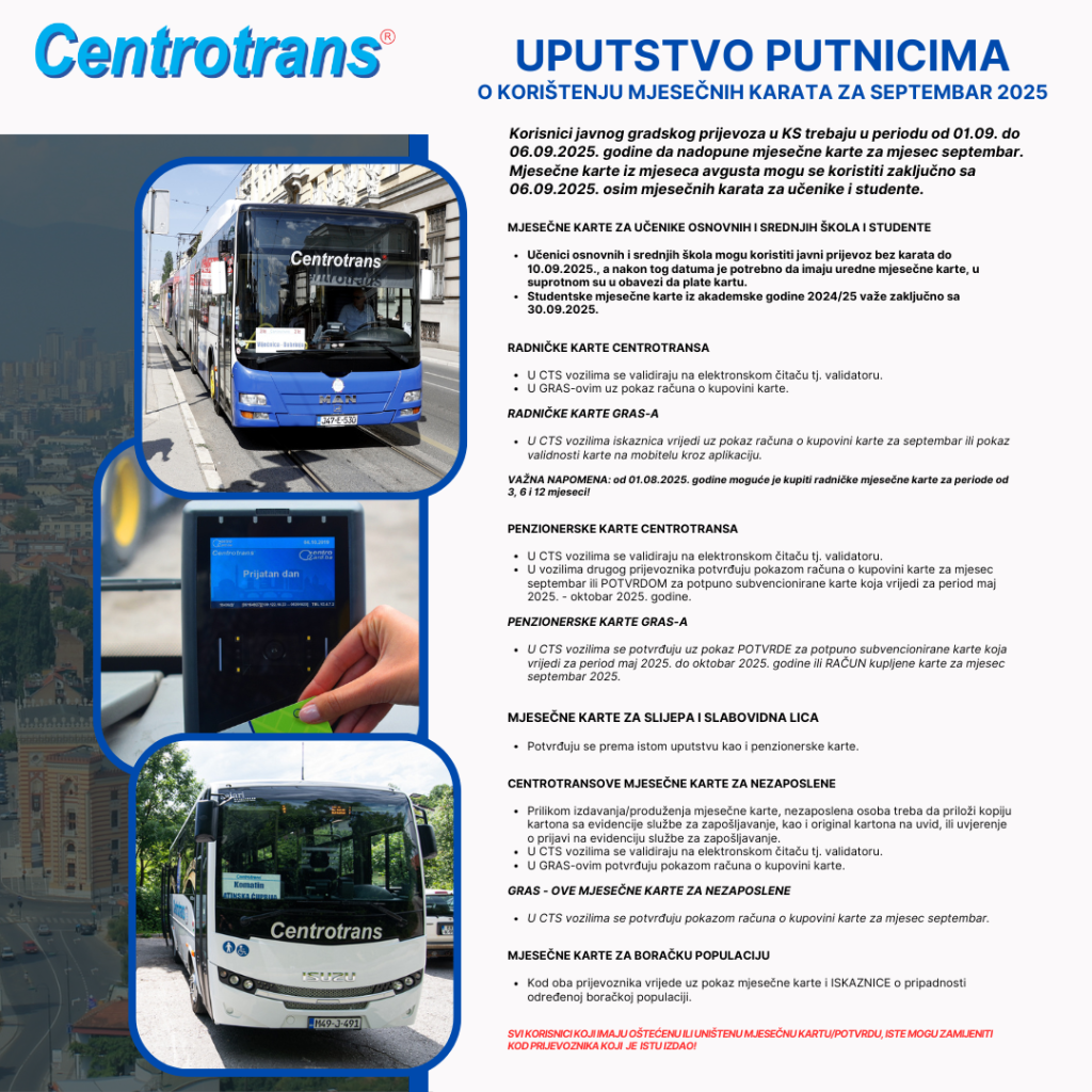 Prodaja mjesečnih karata za javni gradski prijevoz u Kantonu Sarajevo počinje 1.septembra, a završava 6. septembra. U tom periodu, putnici mogu izvršiti dopunu svojih mjesečnih karti za septembar, što se odnosi na radničke mjesečne karte, kao i karte za penzionere, nezaposlene osobe i boračku populaciju.