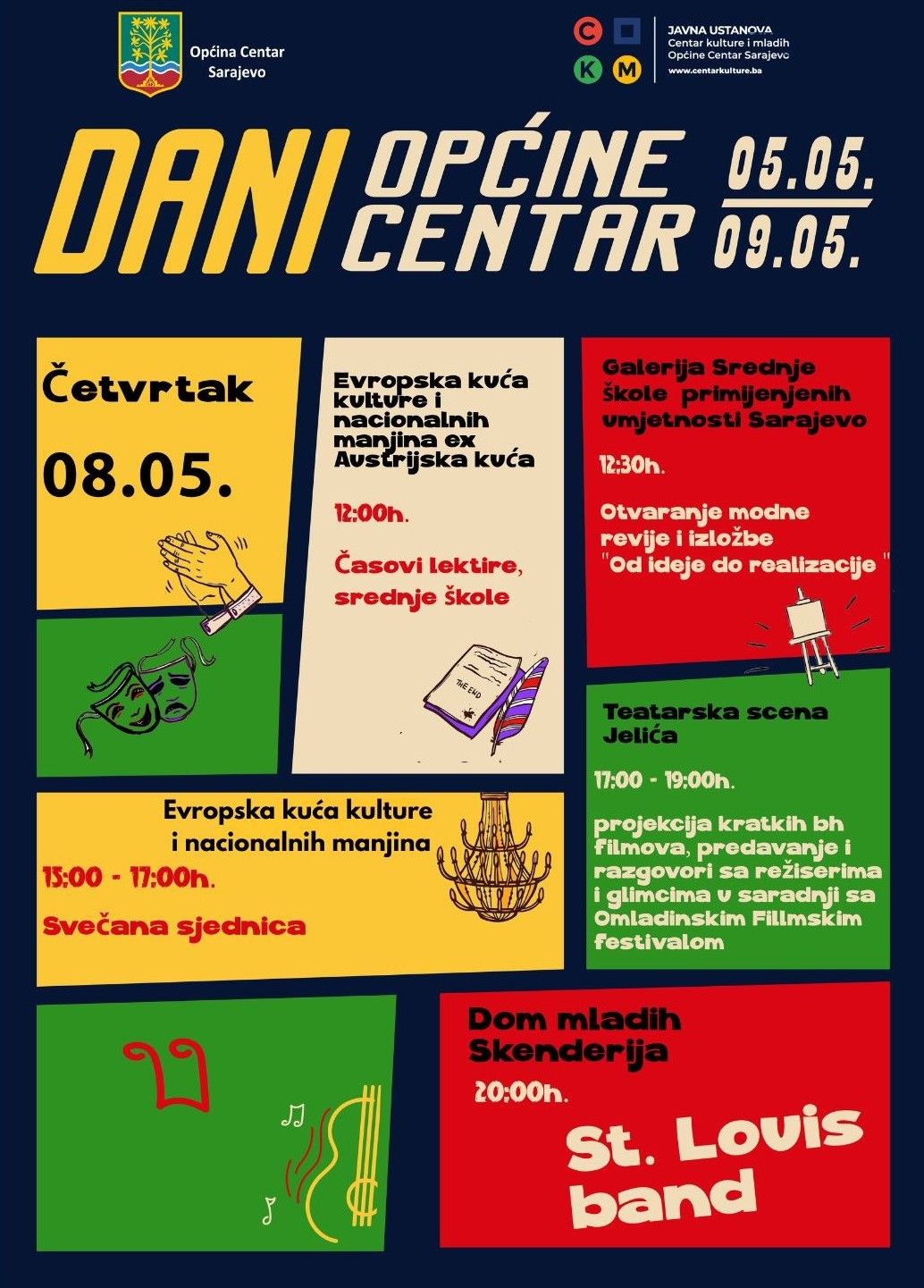U okviru manifestacije Dani Općine Centar, u četvrtak, 8. maja 2025. godine, građani će imati priliku uživati u raznovrsnom kulturnom i umjetničkom programu koji uključuje književnost, modu, film i muziku. Program se održava na nekoliko lokacija u Sarajevu, a sadržaji su besplatni i otvoreni za sve zainteresovane. Sutra se ujedno obilježava i Dan mladih Općine Centar.