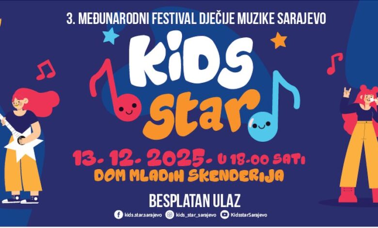 Treći međunarodni festival dječije muzike Sarajevo „Kids Star“ bit će održan 13. decembra u Domu mladih Skenderija, u orgaizaciji Udruženja za očuvanje i razvoj umjetnosti „Artista“. Na pozornici će 20 izvođača iz BiH, Hrvatske, Srbije, Crne Gore, Slovenije i Ukrajine u kategorijama: Male i Mlade zvijezde, pokazati svoj talenat, energiju i ljubav prema muzici.