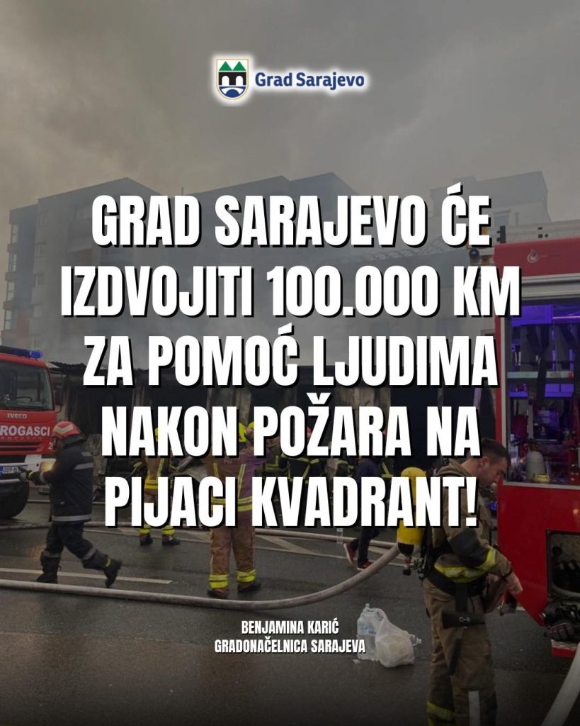 –Zahvaljujući podršci kolegija gradskog vijeća, Grad Sarajevo će izdvojiti 100.000 KM za pomoć nakon požara na pijaci Kvadrant na Otoci. Grad Sarajevo je uz svoje gradjane – napisala je Karić.