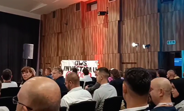 Danas je grupa građana i građanki u Sarajevu u jednom od sarajevskih hotela prekinula uvodni govor Jeff Barra, glavnog evangeliste Amazon Web Servis (AWS), zbog učešća AWS u genocidu u Gazi.