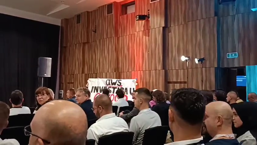 Danas je grupa građana i građanki u Sarajevu u jednom od sarajevskih hotela prekinula uvodni govor Jeff Barra, glavnog evangeliste Amazon Web Servis (AWS), zbog učešća AWS u genocidu u Gazi.