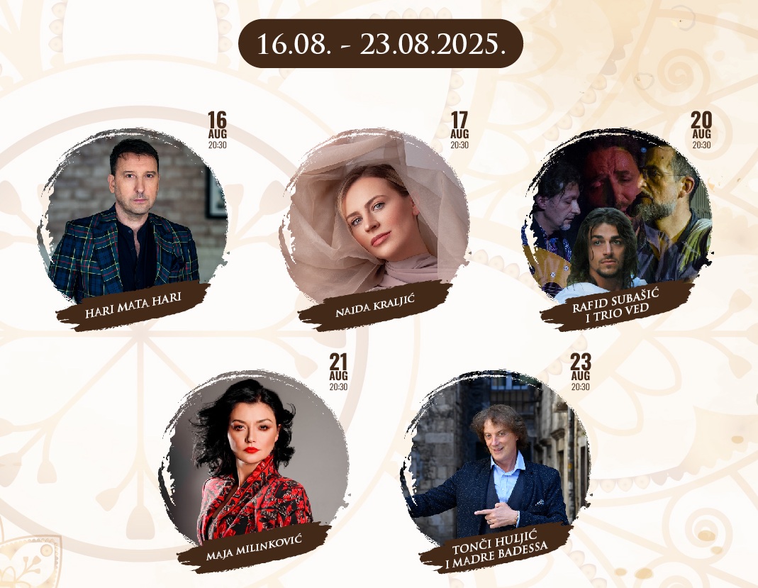 Nakon nastupa Harija Varešanovića drugo veče, u nedjelju, 17. augusta, na programu je koncert sarajevske interpretatorice sevdalinki i tradicionalne muzike, Naide Kraljić. Do kraja festivala publika će još imati priliku uživati u nastupima: Rafida Subašića, vrsnog vokalnog interpretatora i jednog od najboljih perkusionista u regionu sa pratnjom Trio Veda (srijeda, 20. august), Maje Milinković, poznate pjevačice i kantautorice, koja će publici ponuditi spoj fada i sevdalinke (četvrtak, 21. august), dok će festival zatvoriti sjajni Tonči Huljića i bend Madre Badessa, koji donose kombinaciju mediteranskog melosa, popa, klasike i etno zvuka (subota, 23. august).