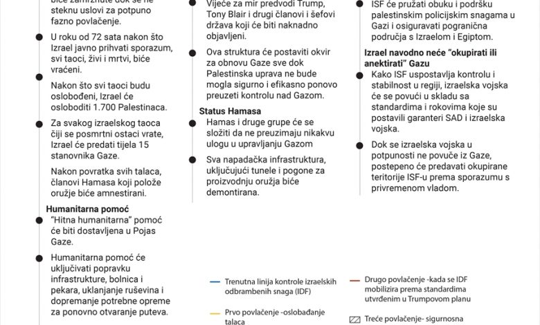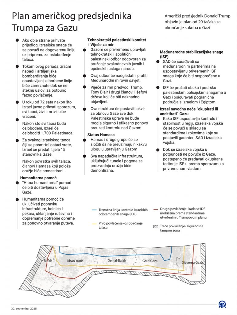 Infografika pod nazivom “Plan američkog predsjednika Trumpa za Gazu” kreirana u Ankari, Turska, 30. septembra 2025. Američki predsjednik Donald Trump objavio je plan od 20 tačaka za okončanje sukoba u Gazi.
