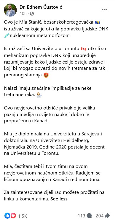 Na svom Facebook profilu podijelio je priču o još jednoj uspješnoj Bosanki koja se zove Mia Stanić koja je otkrila popravku ljudske DNK nuklearnom metamorfozom.