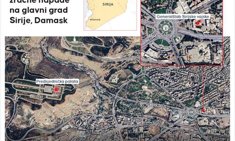 Državna novinska agencija SANA izvijestila je o zračnim napadima na kompleks Generalštaba i Predsjedničku palatu, poznatu kao Qasr al-Shaab, u glavnom gradu.