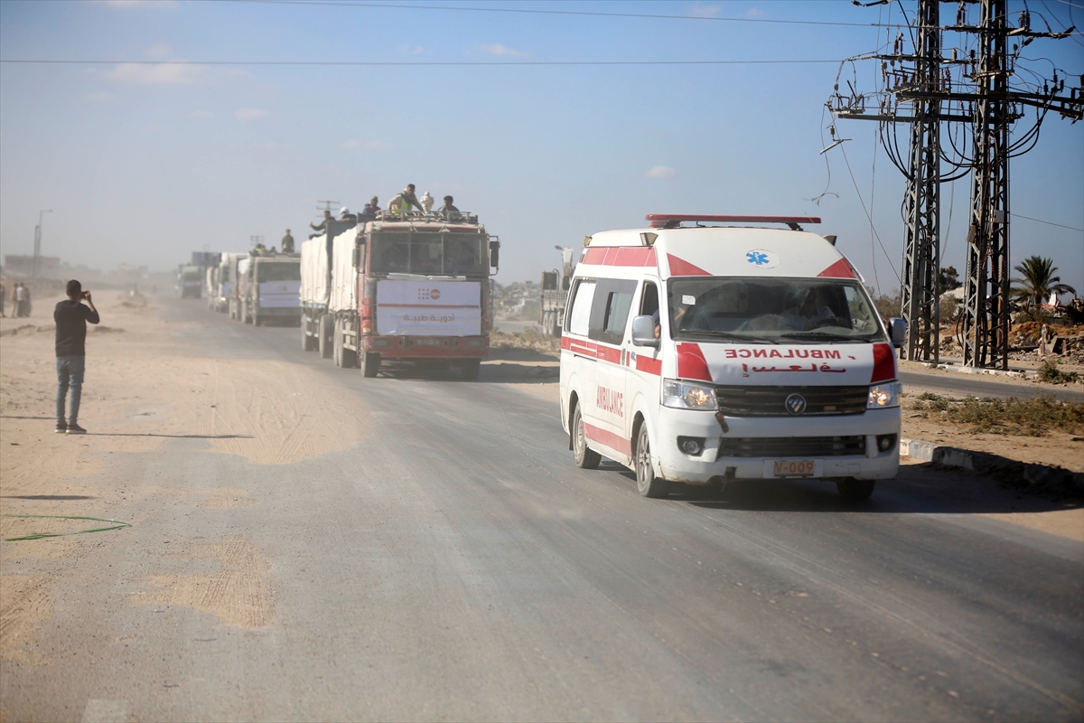 Kamioni natovareni humanitarnom pomoći pristižu u Gazu preko graničnog prelaza Kissufim nakon ranijeg sporazuma o prekidu vatre, u utorak 14. oktobra 2025. godine