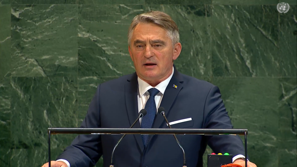Polazeći od teme ovogodišnjeg zasjedanja Generalne skupštine Ujedinjenih nacija, koja glasi: „Bolje zajedno”, 80 godina za mir, razvoj i ljudska prava“, dozvolite mi da sa ovoga značajnog mjesta, u ime Bosne i Hercegovine i svih njenih građana, izrazim čestitke organizaciji Ujedinjenih nacija koja obilježava 80 godina od svoga osnivanja, ali istovremeno i 80 godina neprekidnog rada na onome što je temeljni cilj ove organizacije, a to je obezbjeđivanje i održavanje mira u svijetu.