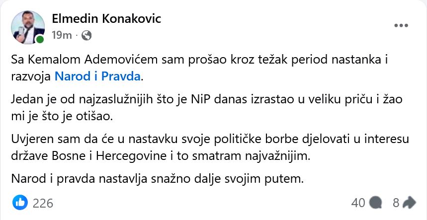 “Sa Kemalom Ademovićem sam prošao kroz težak period nastanka i razvoja Narod i Pravda. Jedan je od najzaslužnijih što je NiP danas izrastao u veliku priču i žao mi je što je otišao”, poručio je Konaković u svojoj reakciji.