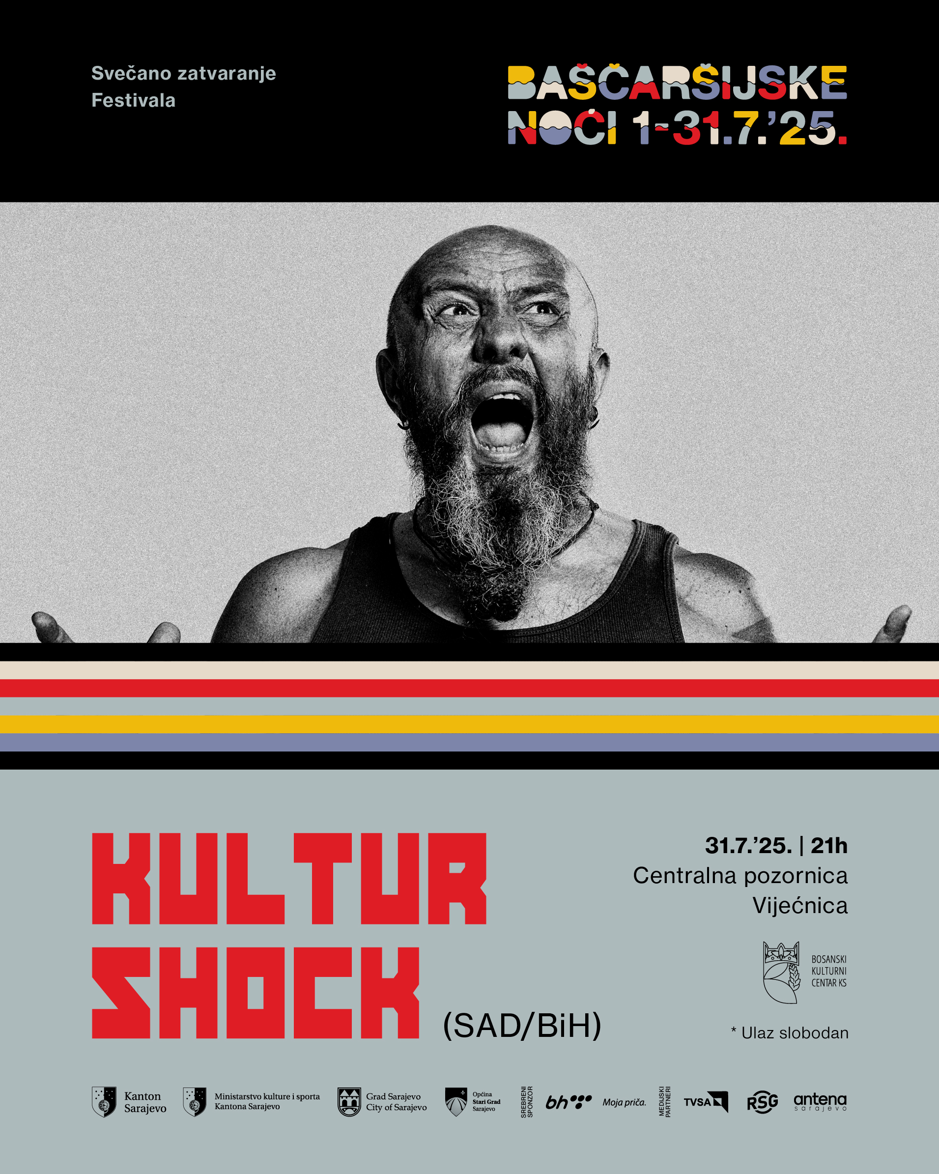 Legendarna balkansko-američka grupa Kultur Shock, nakon nekoliko godina pauze vraća se u Sarajevo, a nastupit će na Centralnoj pozornici Vijećnica, na zatvaranju Festivala Baščaršijske noći, sa početkom u 21 sat. Kultur Shock je poznat po energičnim i nezaboravnim nastupima uživo, a sada imate priliku da ih doživite izbliza. Predvođeni frontmenom Srđanom Jevđevićem, donose zvuk koji udara pravo u srce, beskompromisno i iskreno.