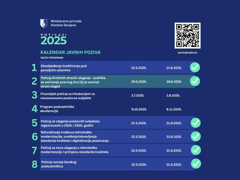 Ministarstvo privrede Kantona Sarajevo objavilo je Javni poziv za dodjelu poticajnih sredstava s ciljem poticanja direktnih stranih ulaganja na području Kantona Sarajevo.