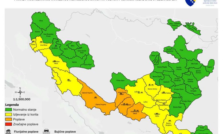 Obavještenje o prognozi vanrednog hidrološkog stanja odnosi se na područje Unsko-sanskog, Srednjobosanskog, Zeničko-dobojskog i Kantona Sarajevo.
