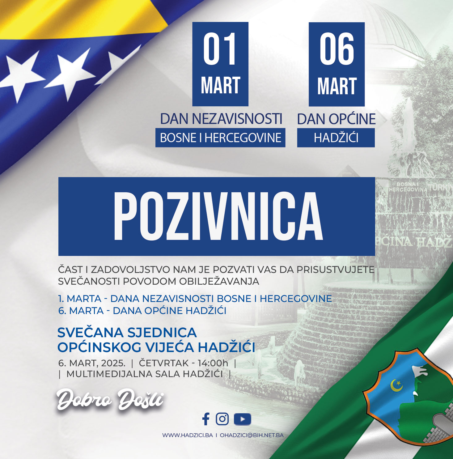 Nakon toga, u 14:00 sati, u Multimedijalnoj sali Hadžići bit će održana svečana sjednica Općinskog vijeća, na kojoj će biti uručena Općinska priznanja zaslužnim pojedincima i institucijama, kao i nagrade za izuzetne sportske rezultate.