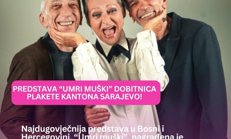 Plaketa Kantona Sarajevo će biti dodijeljena predstavi “Umri muški” kao priznanje za izuzetan doprinos kulturnom razvoju i umjetničkoj baštini Kantona Sarajevo.
