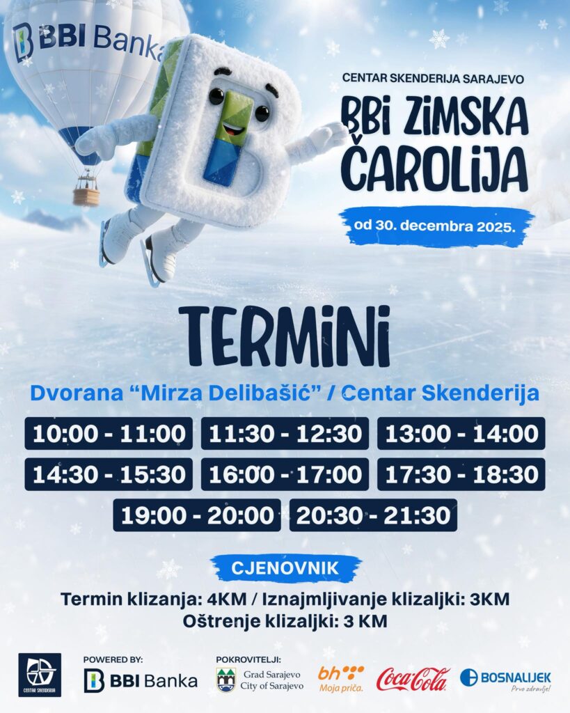 Svečanim otvorenjem na Skenderiji je počela Zimska čarolija. Na 1.800 kvadratnih metara ledene površine građanima je na raspolaganju bogat program – klizanje, muzički i sportski sadržaji te zabava za sve generacije. Besplatan termin klizanja za građane planiran je večeras od 19 do 20 sati.