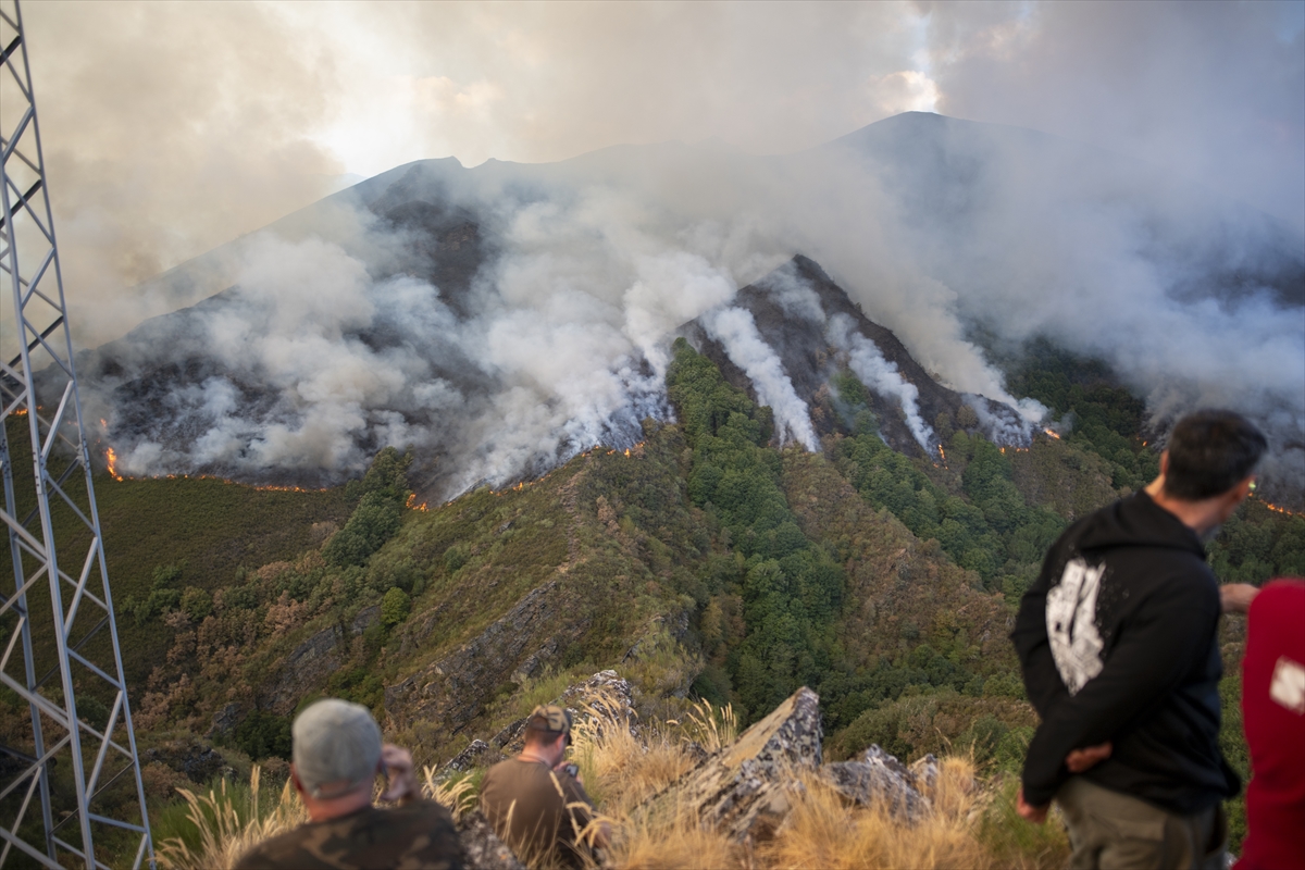 Pogled na izgorjelo područje dok se dim diže u pozadini s aktivnog požara na području Porta u Galiciji. Španija je suočena s najtežom sezonom šumskih požara u historiji: do sada je ove godine uništeno preko 382.600 hektara, a samo u posljednja 24 sata izgorjelo je dodatnih 38.000 hektara zemljišta.