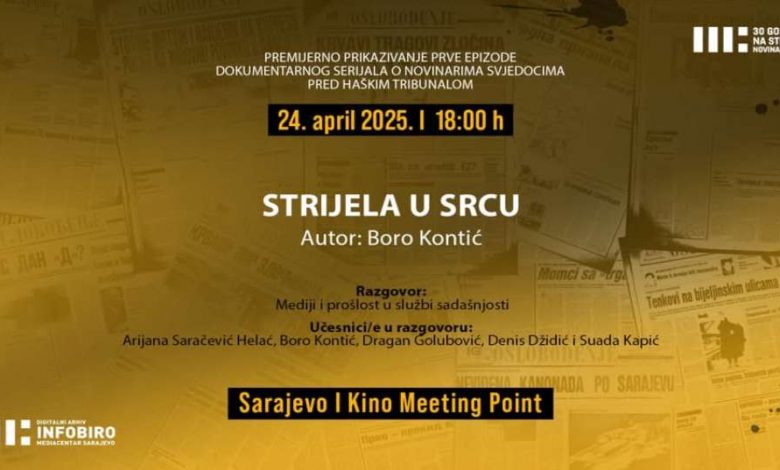 Premijera prve epizode dokumentarnog serijala o novinarima svjedocima pred Međunarodnim krivičnim sudom u Hagu “Strijela u srcu”, autora Bore Kontića, održana je večeras u sarajevskom kinu Meeting Point.