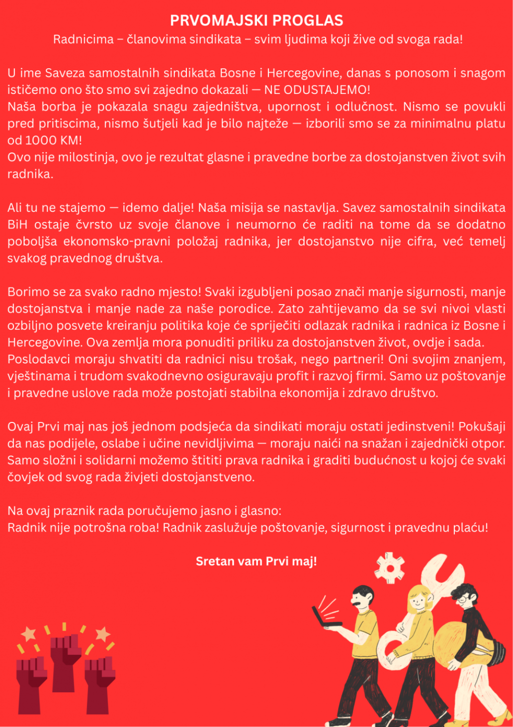 Na ovaj praznik rada poručujemo jasno i glasno: Radnik nije potrošna roba! Radnik zaslužuje poštovanje, sigurnost i pravednu plaću! Sretan vam Prvi maj – navedeno je u Prvomajskom proglasu Saveza samostalnih sindikata BiH.