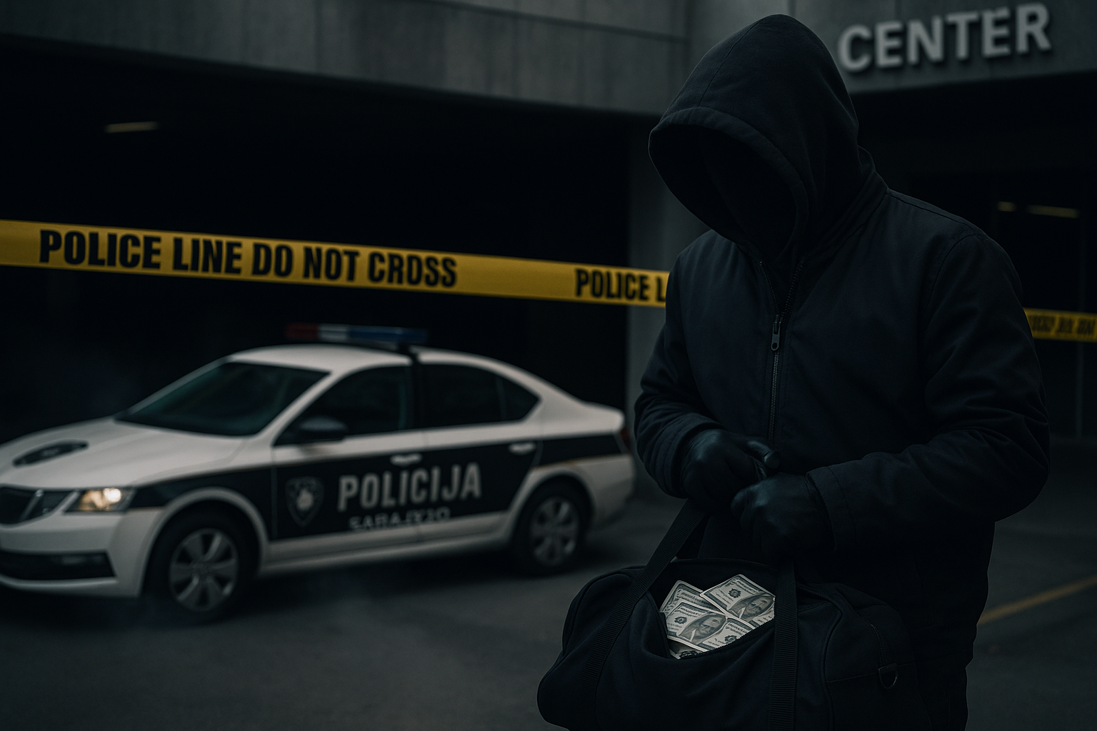 Sumnjiče se da su se 09. juna 2025. godine, oko 13 sati i 25 minuta, motorom stigli ispred ulaza u garažu tržnog centra Bingo u ulici Butmirska 14. Osumnjičeni Bošnjak ušao je pješke u garažu, stavio rukavice na ruke i prišao automobilu u kojem se nalazila direktorica jedne sarajevske firme. Zaprijetio joj je pištoljem i rekao: „Daj pare“. Na zadnjem sjedištu automobila nalazila se torba u kojoj je bilo 113.103,40 KM, koju je osumnjičeni uzeo, a zatim pobjegao zajedno sa Mušovićem.