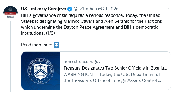 Kako stoji na stranici američkog State departmenta oni su ugrozili stabilnost regiona potkopavanjem Dejtonskog mirovnog sporazuma i demokratskih procesa ili institucija.