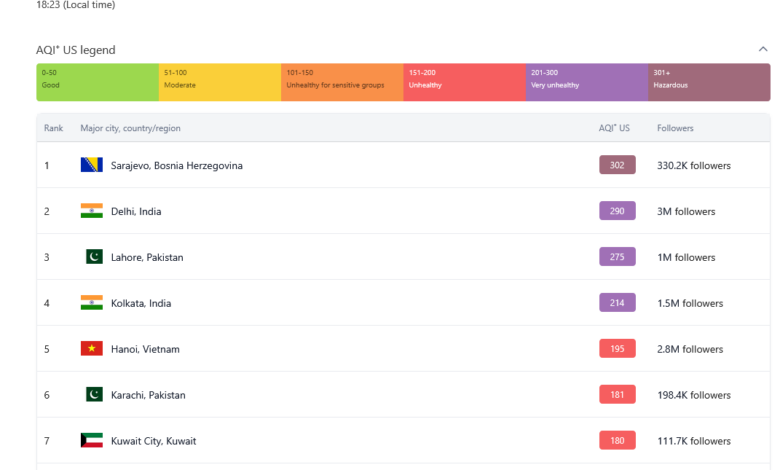 Portal IQAir, koji prati indeks zagađenja zraka u svijetu, u poslijepodnevnim satima je objavio ažuriranu listu gradova na kojoj se Sarajevo našlo na prvom mjestu sa zrakom u kategoriji “vrlo nezdrav” po zdravlje.