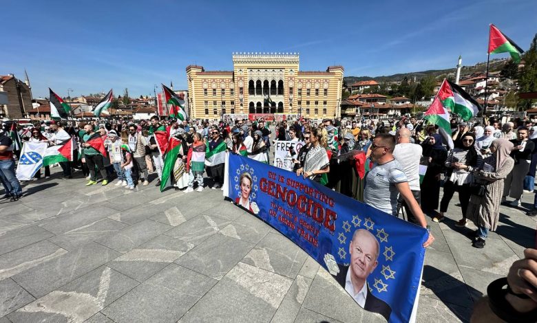 Desetine građana okupile su se preko puta Vijećnice gdje su istaknute zastave Bosne i Hercegovine, Palestine i Južnoafričke Republike. Čule su se parole i istaknuli transparenti podrške Palestini, kao oni kojima je osuđen Izrael i države koje ga podržavaju. Organizator skupa je neformalna grupa mladih građana BiH u koordinaciji s Palestinskom zajednicom u BiH i Udruženjem bosanskohercegovačkog-palestinskog prijateljstva.