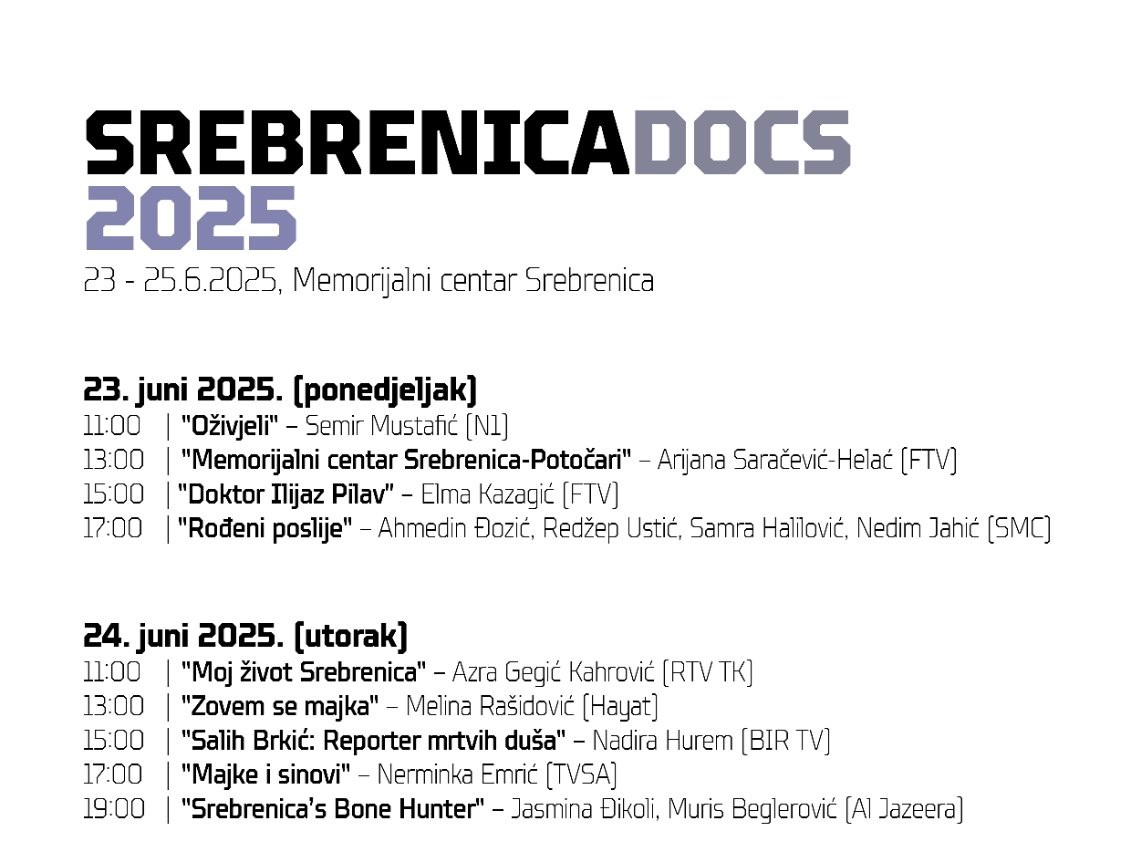 „Prvog dana (23.6.) u 11 sati gledamo film ‘Oživjeli’ Semira Mustafića, u 13 sati film o nastanku Memorijalnog centra Srebrenica-Potočari, zatim u 15 sati priču o doktoru Ilijazu Pilavu. U 17 sati biće premijerno prikazan film ‘Rođeni poslije’, ostvarenje mladog tima Memorijalnog centra, koje prenosi iskustva generacije rođene nakon genocida. Za drugi dan programa planirani su: ‘Moj život Srebrenica’ u 11 sati, ‘Zovem se majka’ u 13 sati, priča o Salihu Brkiću u 15 sati, zatim u 17 sati ‘Majke i sinovi’ produkcija TVSA, te u 19 sati ‘Srebrenica’s Bone Hunter’. Trećeg dana festivala, u srijedu 25. juna, publika će imati priliku pogledati filmove: ‘Srebrenica očima djeteta’ u 11 sati, ‘Preživio sam… Sadik’ u 13 sati, ‘Zasjeda’ u 15 sati, ‘Pravda & Правда’ u 17 sati, te ‘Ubijene svjetove’ u 19 sati. Ulazak na sve projekcije je besplatan“, izjavila je Mirela Osmanović iz Memorijalnog centra Srebrenica.