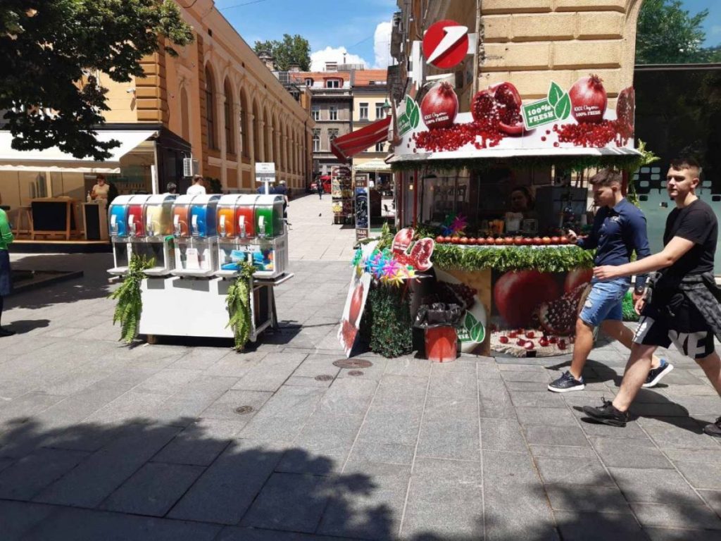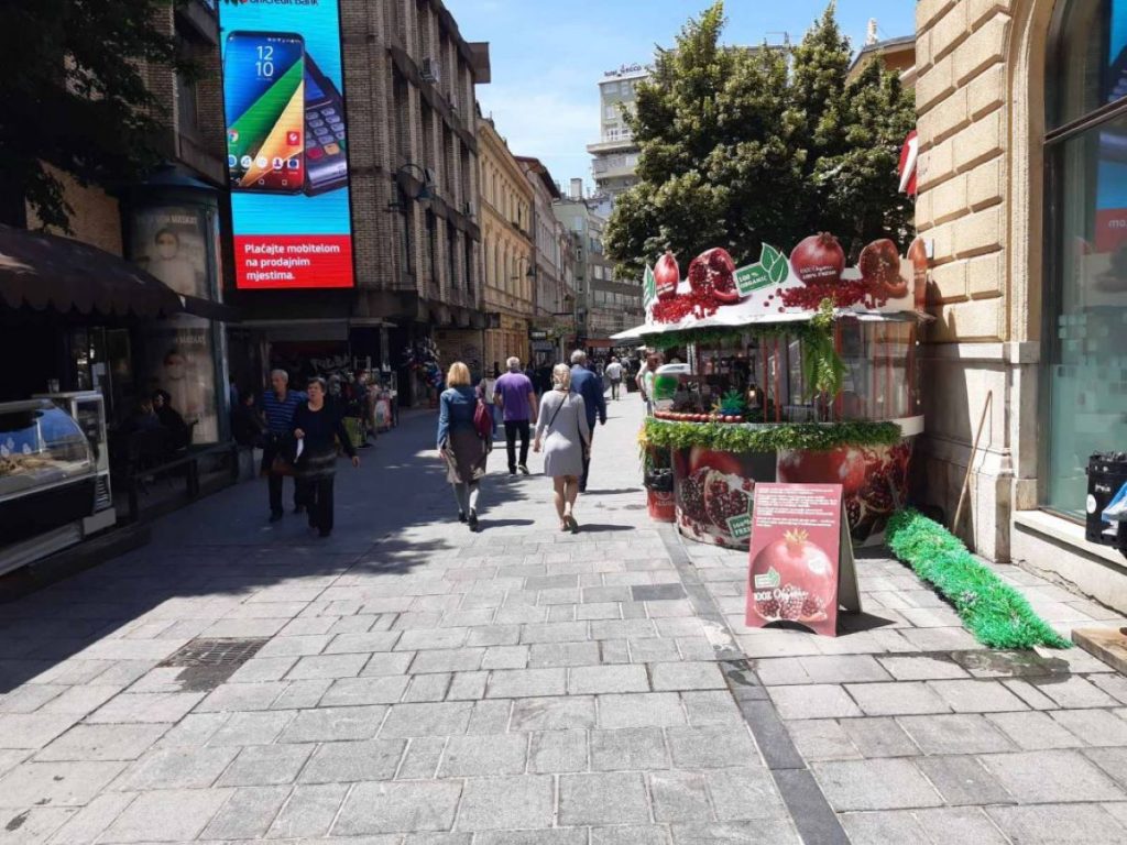 Na samoj granici dvije gradske općine, u dijelu ulice Ferhadija koji pripada Općini Centar, postavljeni su sadržaji potpuno neprimjereni za centralnu pješačku zonu jednog glavnog grada: aparat za cijeđenje soka, prodaja ulaznica, prodaja odjeće, kišobrana i drugo.