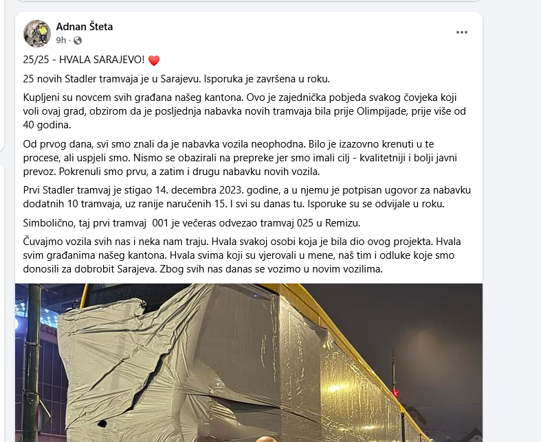 – Ovo je zajednička pobjeda svakog čovjeka koji voli ovaj grad, s obzirom da je posljednja nabavka novih tramvaja bila prije Olimpijade, prije više od 40 godina. Od prvog dana, svi smo znali da je nabavka vozila neophodna. Bilo je izazovno krenuti u te procese, ali uspjeli smo. Nismo se obazirali na prepreke jer smo imali cilj – kvalitetniji i bolji javni prevoz. Pokrenuli smo prvu, a zatim i drugu nabavku novih vozila. Prvi Stadler tramvaj je stigao 14. decembra 2023. godine, a u njemu je potpisan ugovor za nabavku dodatnih 10 tramvaja, uz ranije naručenih 15. I svi su danas tu. Isporuke su se odvijale u roku. Simbolično, taj prvi tramvaj 001 je večeras odvezao tramvaj 025 u Remizu. Čuvajmo vozila svih nas i neka nam traju, poručuje Šteta.