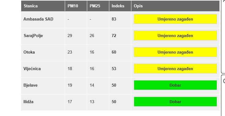 – Na osnovu današnjih mjerenja Zavoda za javno zdravstvo Kantona Sarajevo, provedenih na lokacijama automatskih referentnih stanica za mjerenje kvaliteta zraka u Kantonu Sarajevo, Indeks kvaliteta zraka ukazuje na dobro do umjereno stanje kvaliteta zraka na većini mjernih lokacija, saopćeno je iz Zavoda za javno zdravstvo KS.