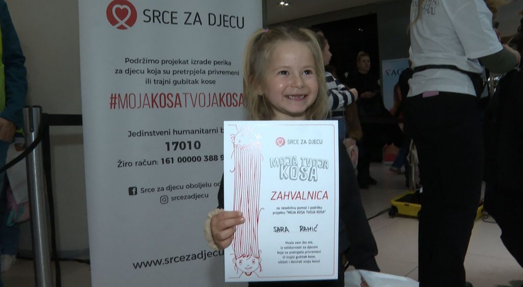 Udruženje Srce za djecu oboljelu od raka organizovalo je u subotu u Sarajevu javno-humanitarnu akciju darivanja kose u okviru projekta “Moja kosa, tvoja kosa”, čiji je cilj prikupljanje kose za izradu perika za djecu koja su privremeno ili trajno ostala bez kose zbog bolesti,