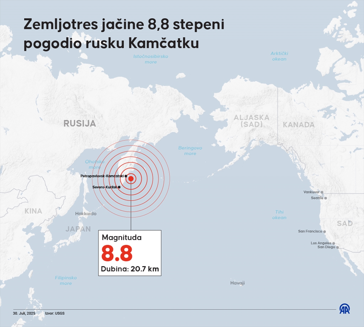 Zemljotres jačine 8,8 stepeni pogodio je u srijedu rusko poluostrvo Kamčatka, nakon čega su izdata upozorenja na cunami širom regije Tihog okeana, saopćio je Američki geološki zavod, javlja Anadolu.