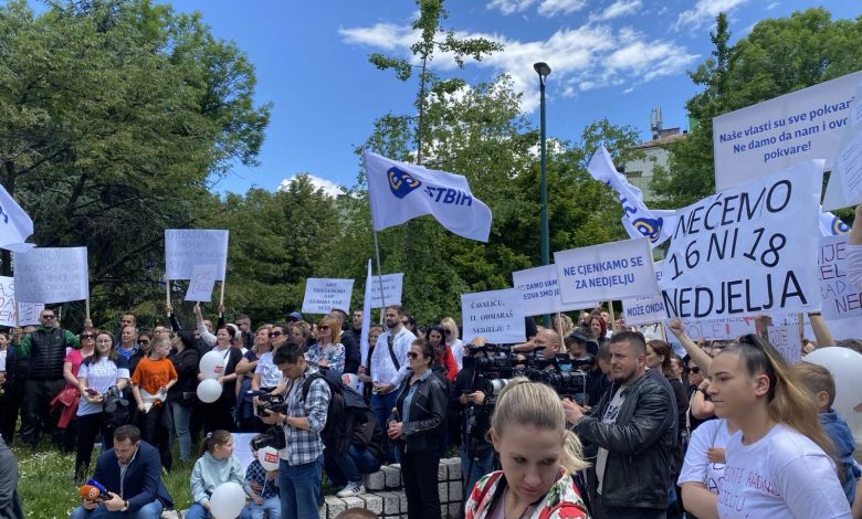Na protestima Sindikata radnika trgovine i uslužnih djelatnosti BiH (STBiH) okupljeni su nosili transparente na kojima je pisalo: “Ne damo nedjelju”, “Naša nedjelja nije na akciji”, Nećemo 16 ni 18 nedjelja”, “Radna nedjelja = Ukradena porodica”.