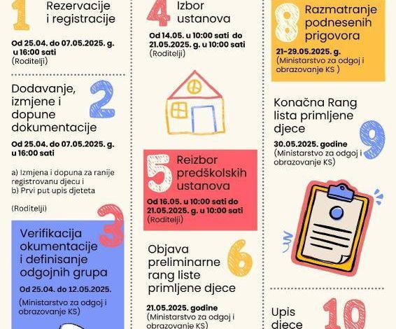 Upis djece u predškolske ustanove za školsku 2025/2026. godinu vršit će se elektronski putem EMIS sistema Ministarstva https://emis.edu.ba/ i odvijat će se u više faza: