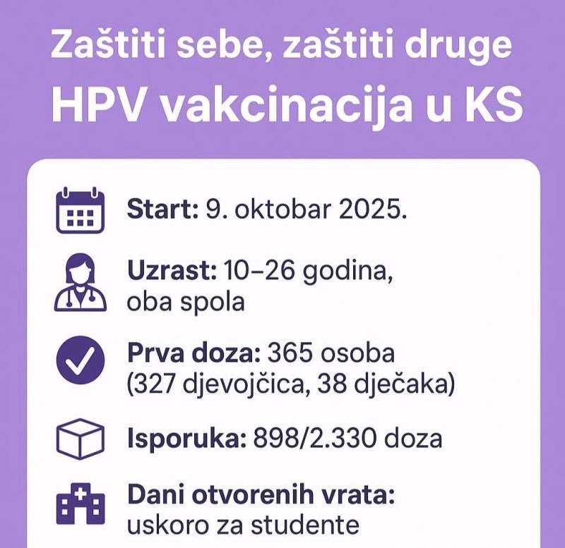 “Naš cilj je da svako dijete i svaka porodica budu zaštićeni od bolesti koje se mogu spriječiti. Zato pozivamo roditelje i staratelje da iskoriste ovu priliku i vakcinišu svoju djecu i omladinu, jer je HPV vakcinacija i naša zaštita i tuđa sigurnost”, poručuju iz Ministarstva zdravstva KS.