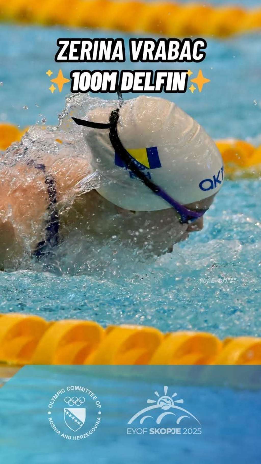 – Mlada bosanskohercegovačka plivačica Zerina Vrabac, koja je u finalu na 200 metara delfin bila druga te osvojila srebrenu medalju, danas je u finalu na 100 metara delfin bila peta na 18. ljetnom Evropskom olimpijskom festivalu mladih (EYOF), za sportaše i sportašice od 14 do 18 godina, koje se održava u Skoplju i Kumanovu u Sjevernoj Makedonije te hrvatskom gardu Osijeku, koji je suorganizator ovog takmičinja evropskih sportskih nada.