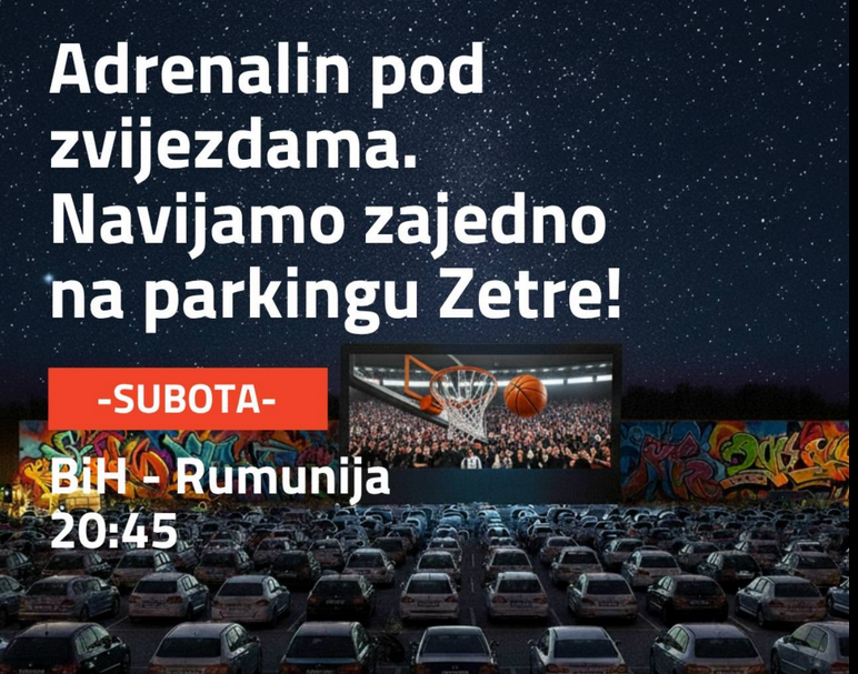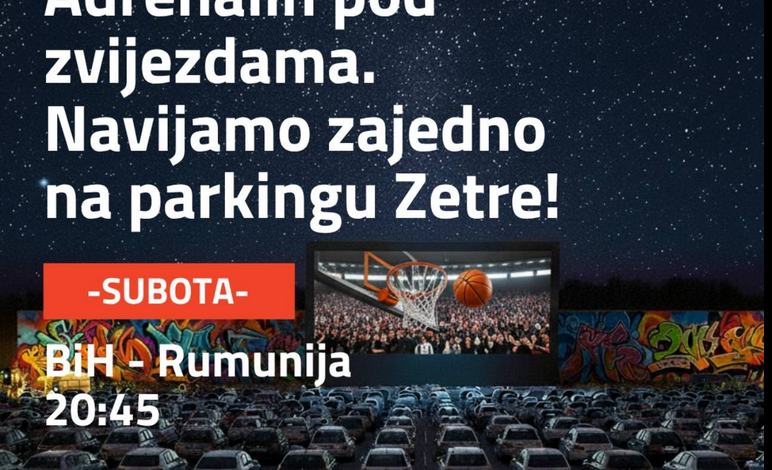 Olimpijska arena Zetra saopćila je da će večeras, na parking prostoru ispred dvorane, biti organizovano zajedničko gledanje fudbalske utakmice između Bosne i Hercegovine i Rumunije. Početak druženja i prenosa planiran je za 20:45 sati.