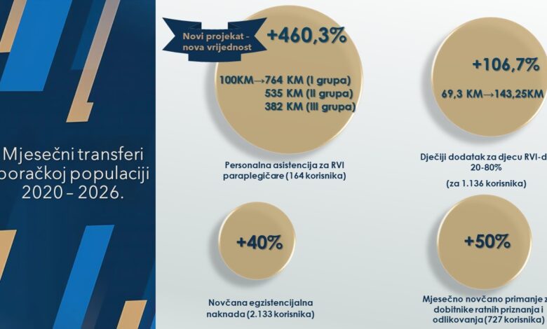 Najznačajnija novina predstavlja projekt personalne asistencije za ratne vojne invalide – paraplegičare, koji je uveden u 2021. godini kao potpuno nova mjera podrške i koji od tada bilježi najveći rast. Povećanjem vrijednosti ovog projekta napravljen je snažan institucionalni iskorak u pružanju pomoći najtežim kategorijama ratnih vojnih invalida. Iznos podrške povećan je sa 100 KM u 2021. godini na 764 KM za I grupu, 535 KM za II grupu i 382 KM za III grupu u 2026. godini, a program trenutno obuhvata 164 korisnika.