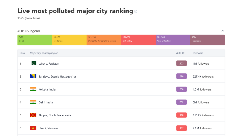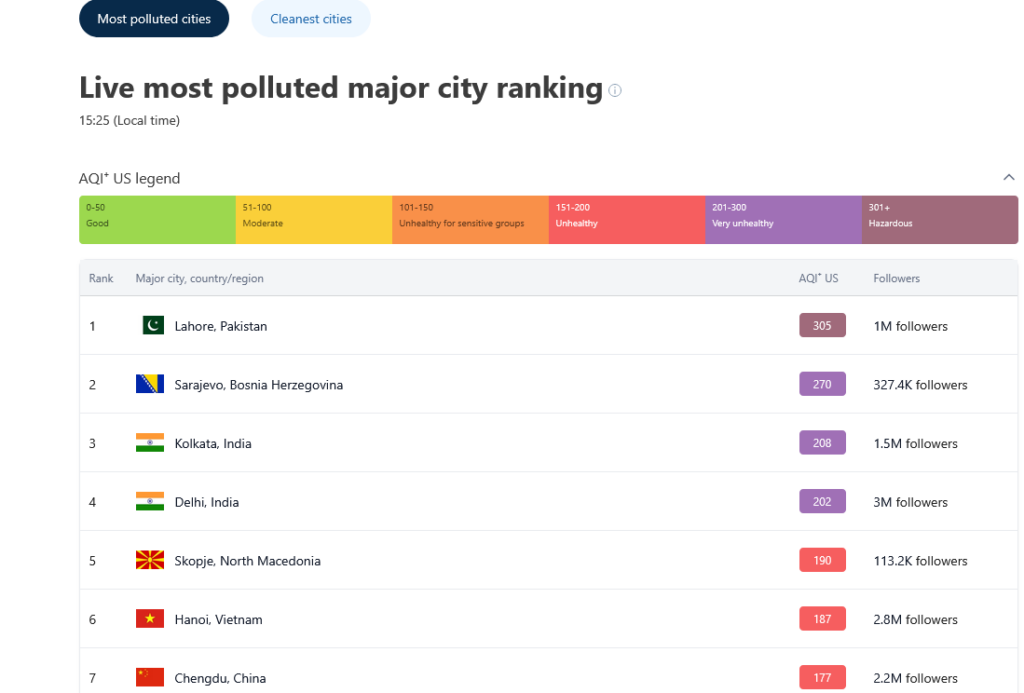 Na listi stranice koja mjeri kvalitet zraka Sarajevo je osvanulo na drugom mjestu u svijetu, odmah nakon Lahorea u Pakistanu.