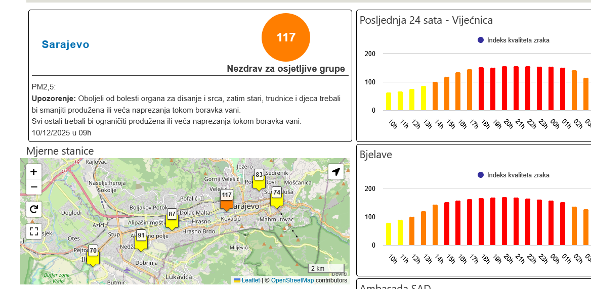 Kvalitet zraka u Sarajevu prema mjerenjima nezdrav je za osjetljive grupe, te se preporučuje da oboljeli od bolesti organa za disanje i srca, zatim stari, trudnice i djeca smanje produžena ili veća naprezanja tokom boravka vani.