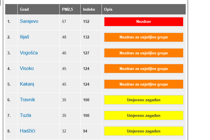 Moguća pojava pojačanih simptoma i intenziteta bolesti kod osoba s bolestima srca i disajnih organa, poput astme. Svi ostali bi mogli početi osjećati negativan utjecaj zagađenja na zdravlje. Sljedeće grupe trebaju smanjiti bilo kakve vanjske fizičke aktivnosti: plućni i srčani bolesnici, trudnice, djeca i starije osobe. Produžena ili veća naprezanja tokom boravka vani. trebali bi izbjegavati i svi ostali., objavljeno je na stranici eko.akcija.org