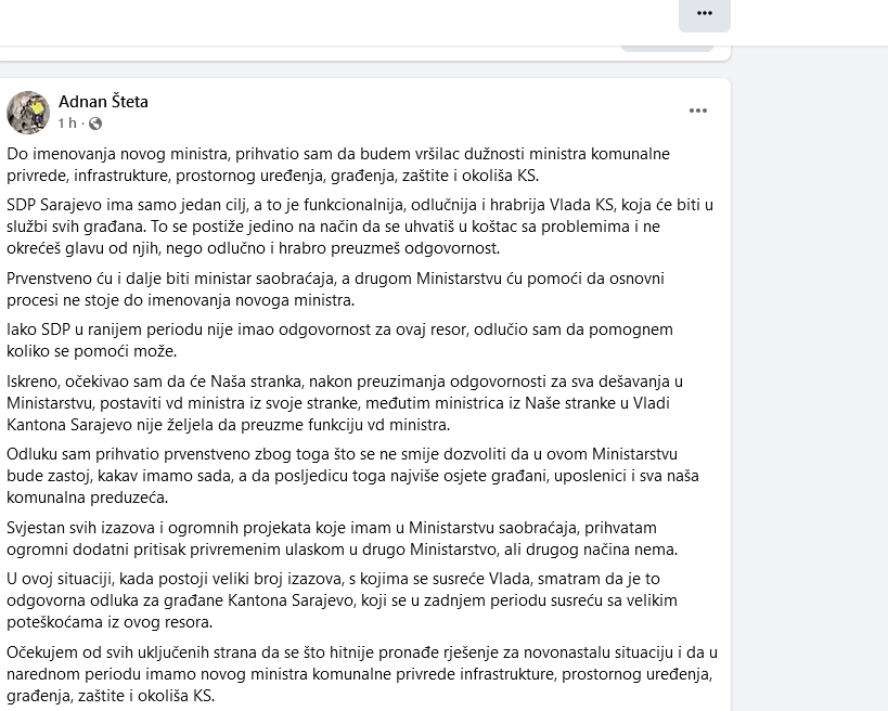 Do imenovanja novog ministra, prihvatio sam da budem vršilac dužnosti ministra komunalne privrede, infrastrukture, prostornog uređenja, građenja, zaštite i okoliša KS, napisao je na zvaničnom profilu Adnan Šteta, ministar saobraćaja u Vladi KS.