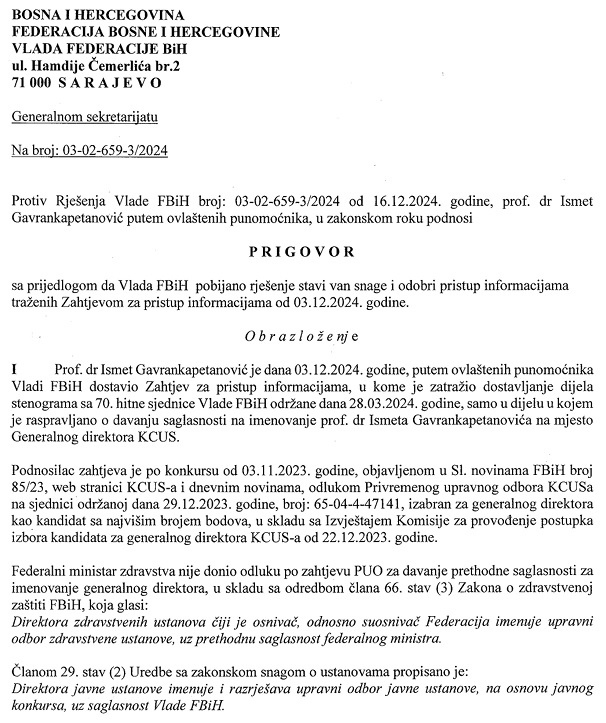 (I) Prof. dr Ismet Gavrankapetanović je dana 03.12.2024. godine, putem ovlaštenih punomoćnika Vladi FBiH dostavio Zahtjev za pristup informacijama, u kome je zatražio dostavljanje dijela stenograma sa 70. hitne sjednice Vlade FBiH održane dana 28.03.2024. godine, samo u dijelu u kojem je raspravljano o davanju saglasnosti na imenovanje prof. dr Ismeta Gavrankapetanovića na mjesto Generalnog direktora KCUS.