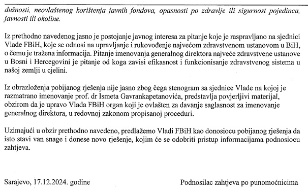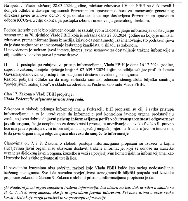 (II) U postupku po zahtjevu za pristup informacijama, Vlada FBiH je dana 16.12.2024. godine, suprotno zakonu, donijela rješenje broj: 03-02-659-3/2024 kojim se odbija zahtjev prof. dr Ismeta Gavrankapetanovića za pristup informacijama i dostavu navedenog stenograma.