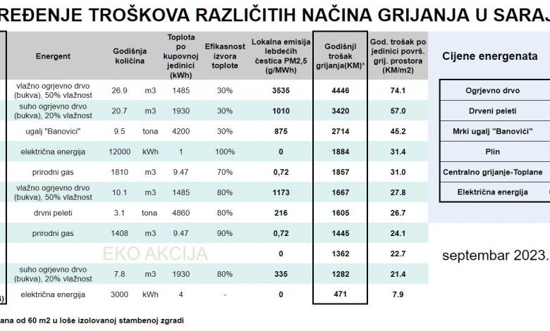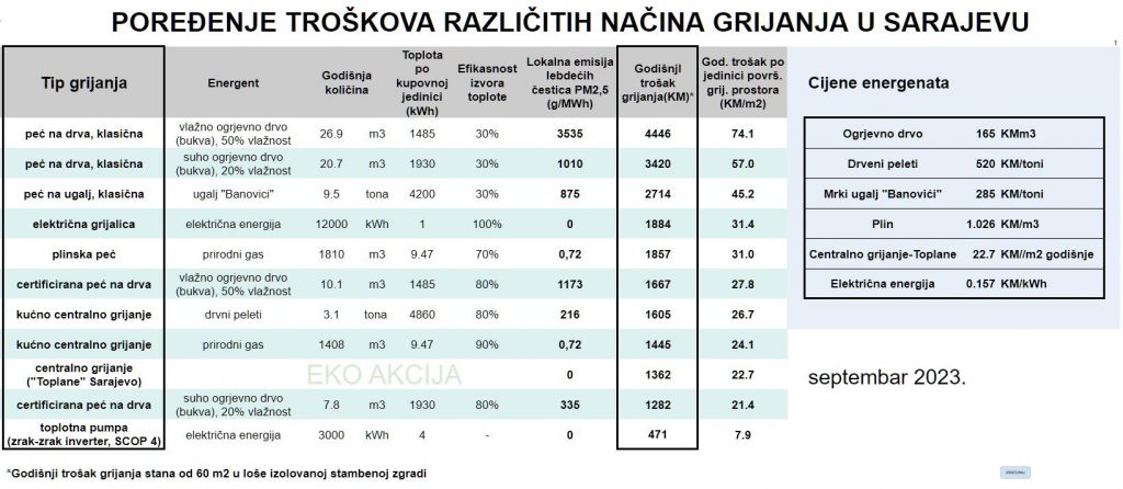 -Nakon dodatnog poskupljenja ogrjevnog drveta, za domaćinstva koja imaju loše peći, a takvih je najviše, grijanje na drva je postalo najskuplja opcija. Najjeftiniji načini grijanja su uglavnom i najmanje štetni po zrak u Sarajevu i drugim bh. gradovima. Nije siromaštvo glavni krivac za zagađeni zrak u našim gradovima, već opća neuređenost. Nepostojanje standarda za kvalitet peći doveo je do toga da su mala ložišta na čvrsta goriva glavni izvor zagađenja zraka u većini naših gradova. Cijena grijanja ponajviše ovisi od efikasnosti uređaja (peć, bojler, grijalica, toplotna pumpa) koji se koristi za grijanje, čak i kada je isti energent u pitanju. Da smo na vrijeme uveli i temeljito primijenili standarde za kvalitet ložišta (bojlera i peći) na čvsta goriva, sada bi imali daleko manje zagađen zrak u našim gradovima, a stanovnici bh. gradova bi se daleko kvalitetnije i jeftinije grijali, poručuju iz Eko akcije.