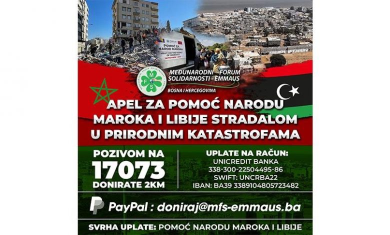 MFS-EMMAUS pokreće apel za pomoć narodu Maroka i Libije na koji se možete direktno i vi uključiti svojim donacijama putem poziva na humanitarni broj, žiro računa ili PayPala Udruženja MFS-EMMAUS.