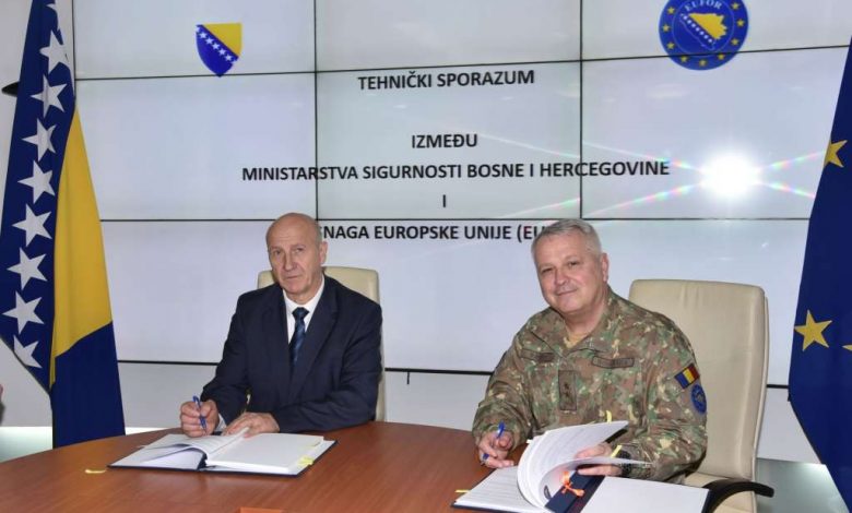 Zamjenik ministra sigurnosti Bosne i Hercegovine Ivica Bošnjak i komandant Snaga Europske unije u BiH (EUFOR) general-major Florin Marian Barbu potpisali su danas u Sarajevu tehnički Sporazum o saradnji Operativno-komunikacijskog centra BiH – 112 i EUFORA-a.